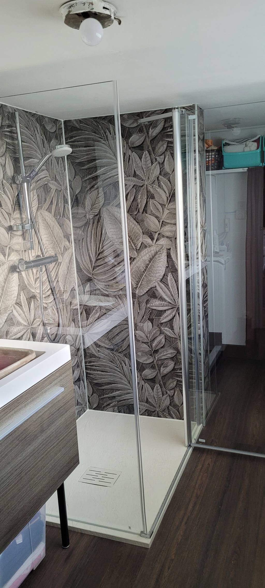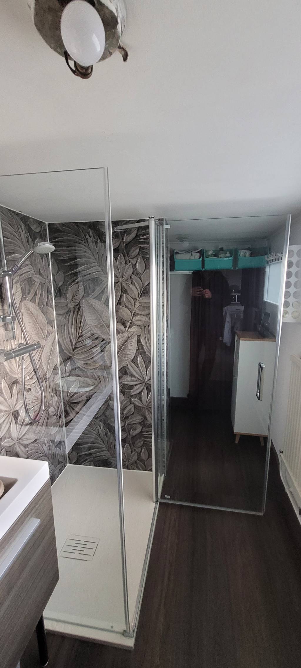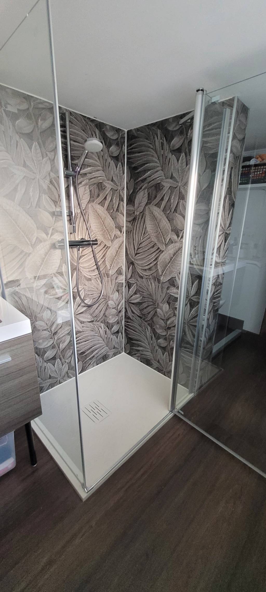 - Réalisation d'une nouvelle douche avec un receveur à faible hauteur pour en facilité l'accès et une paroi de douche sur mesure à cause de la faible hauteur sous plafond de la salle de bains (2.00 m).