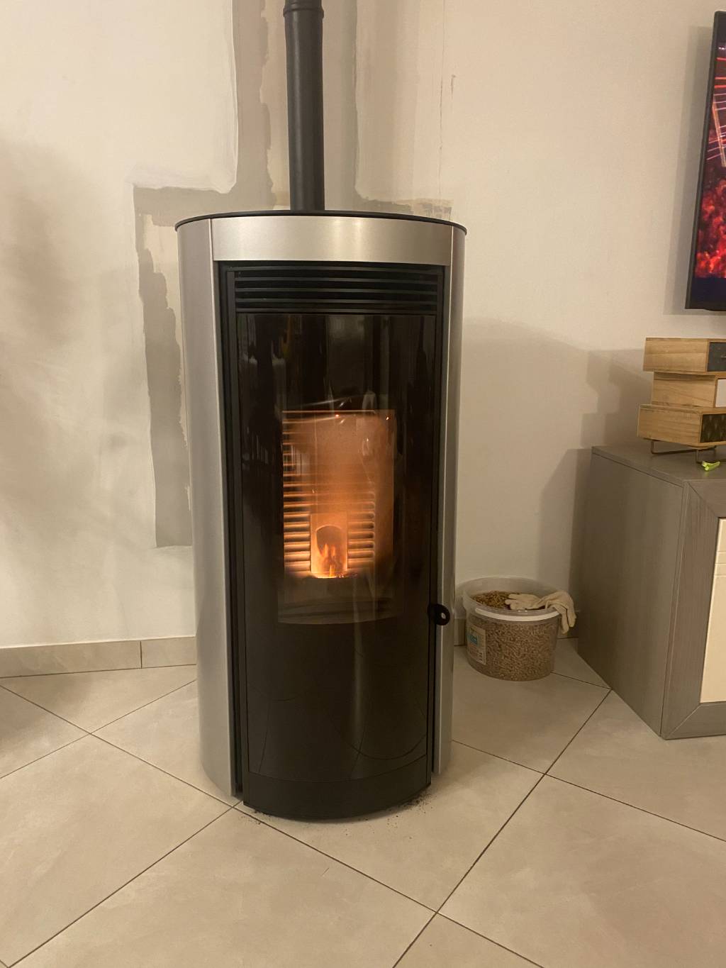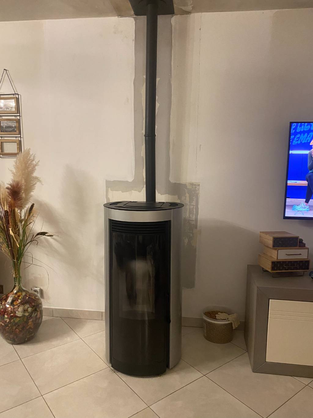 Installation d'un nouveau poêle à granulés de bois de marque CMG type RADIUS de couleur gris métallisé d'une puissance de 6 KW :