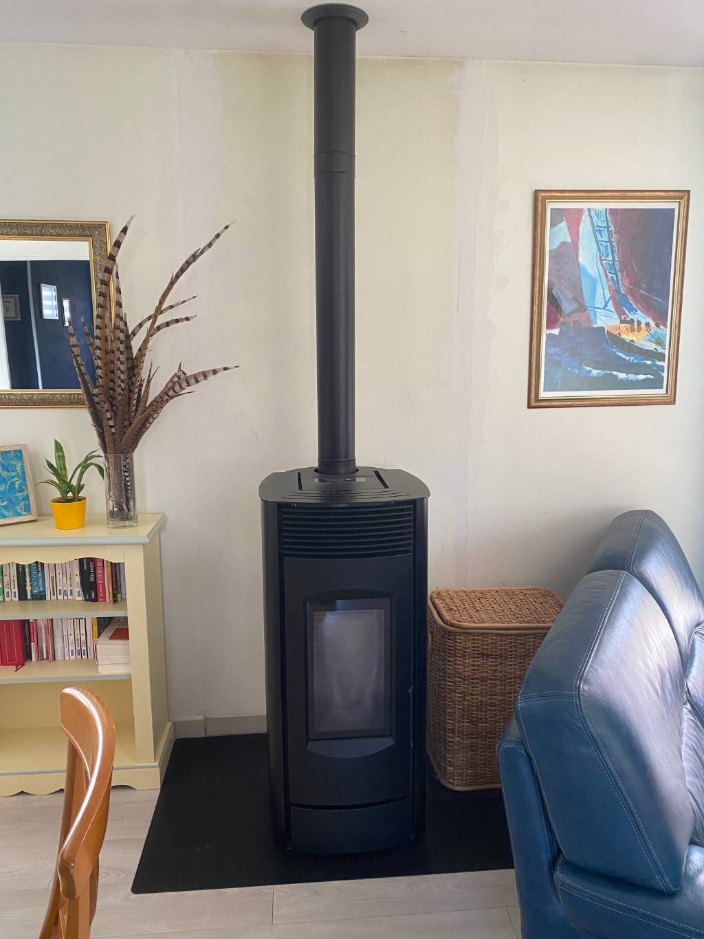 - Installation d'un poêle à pellets de marque CMG avec corps de chauffe étanche BOREA-N6 et habillage STEEL-2 noir d'une puissance de 6 KW